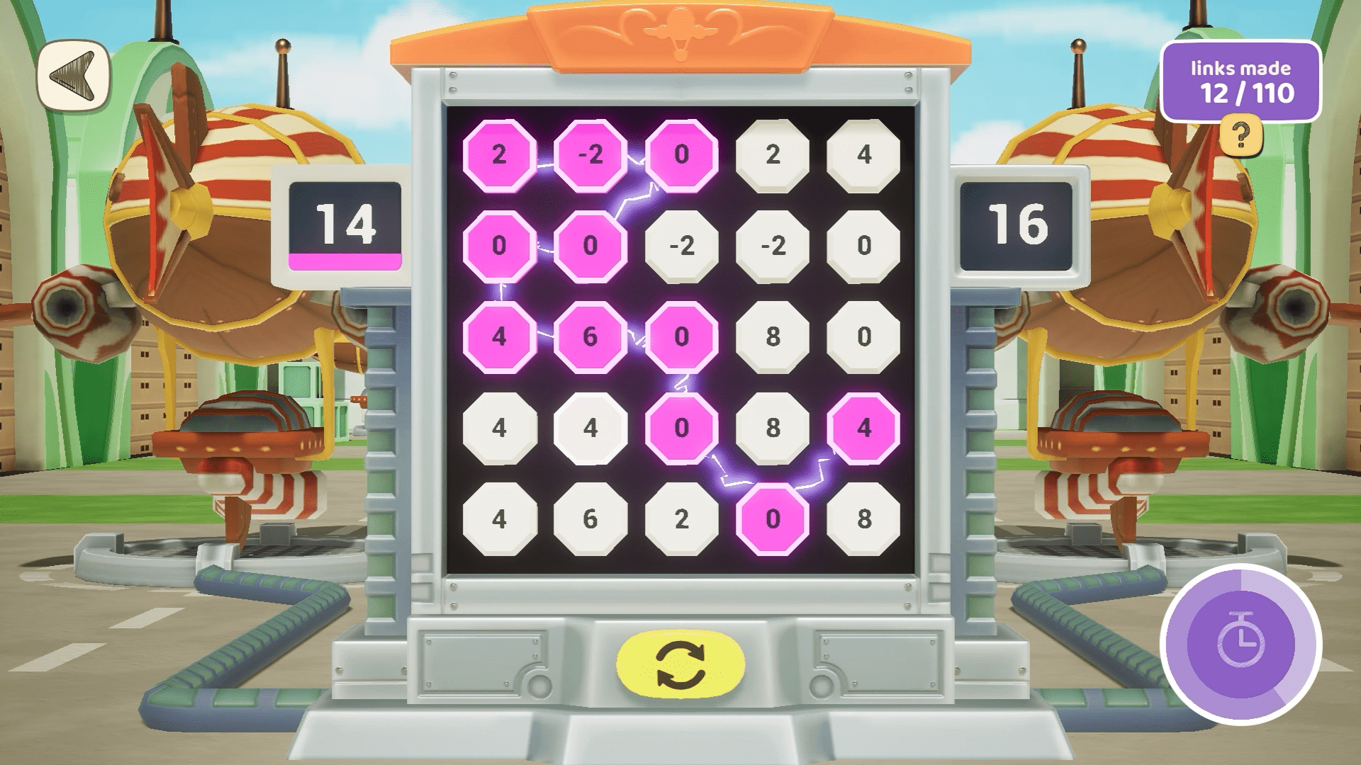 In the Town Squared Airport activities, children use addition or subtraction skills to link numbered cells in a grid, to create a chain that equals a target number. Once the target number is achieved, those cells drop away and the grid is repopulated, ready for the child to find another way to make the target number. This core interaction is referred to as a “game mechanic”. Starting with single digits and simple addition tasks, the game increases in complexity so kids are thinking hard about how to combine numbers to achieve the target. The game is wonderfully satisfying to play and can become quite fast-paced and complex at advanced levels.